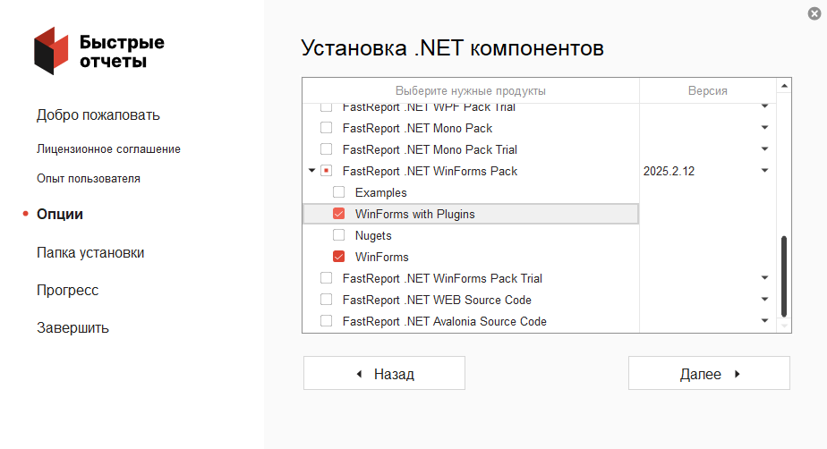 При установке FastReport .NET WinForms на этапе «Установка .NET компонентов» можно выбрать варианты «WinForms» и «WinForms with Plugins».