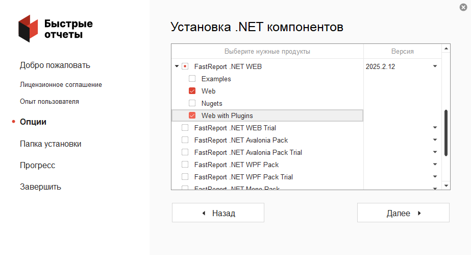Аналогично, при установке FastReport .NET WEB можно выбрать пункты «Web» и «Web with Plugins».