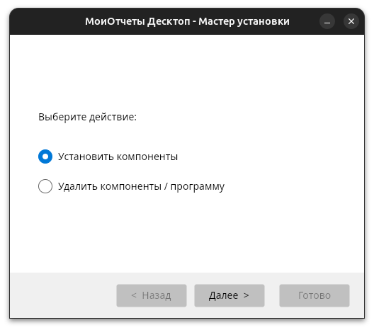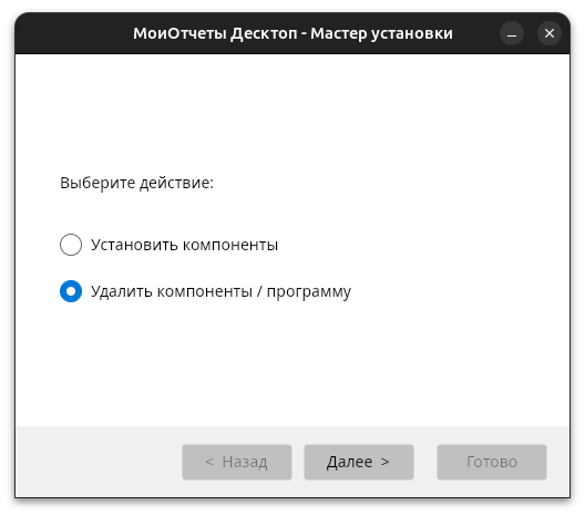 Для удаления установленного приложения воспользуйтесь программой «МоиОтчеты Установка/Удаление». На первом шаге выберите тип действия – «Удалить компоненты/программу» и нажмите «Далее».