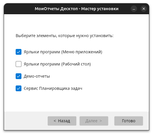 После установки пакета в меню приложений будет добавлено приложение «МоиОтчеты Десктоп Установка/Удаление». Точное место зависит от оконного менеджера, который используется в вашем дистрибутиве: