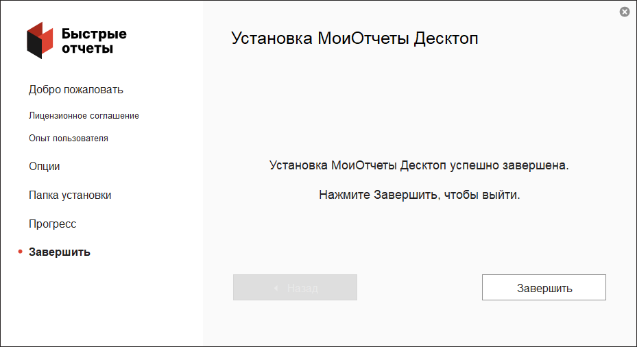 Диалог завершения установки будет показан после установки всех выбранных компонентов. Чтобы закрыть установщик нажмите кнопку «Завершить».