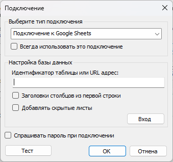 В поле «Идентификатор таблицы или URL адрес» указываем идентификатор таблицы или URL адрес. Например, при URL адресе https://docs.google.com/spreadsheets/d/1BxiMVs0XRA5nFMdKvBdBZjgmUUqptlbs74OgvE2upms идентификатором таблицы будет значение «1BxiMVs0XRA5nFMdKvBdBZjgmUUqptlbs74OgvE2upms».