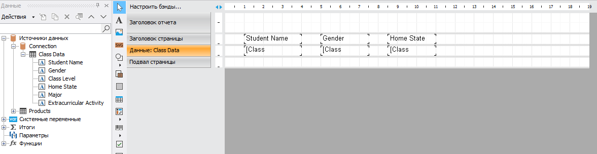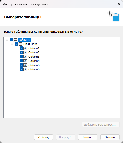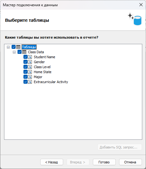 Возвращаемся в дизайнер FastReport .NET. Если подключение прошло успешно, в следующем окне отобразится список таблиц из Google Sheets, доступных для выбора. На скриншотах ниже показано, как меняется список полей в зависимости от использования опции «Заголовки столбцов из первой строки»: