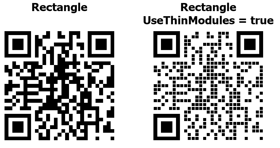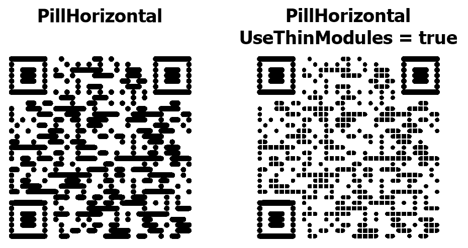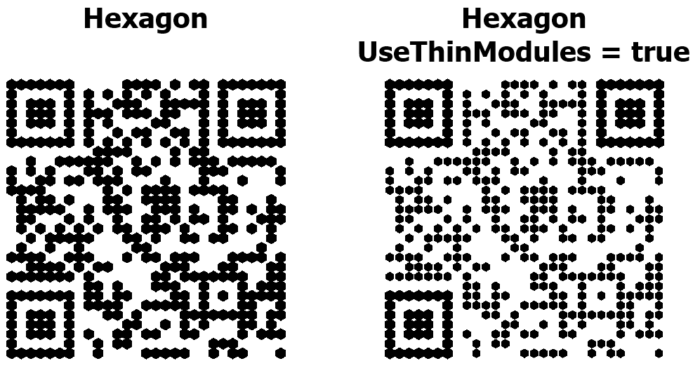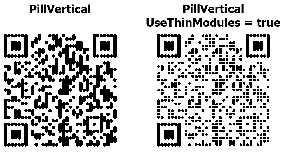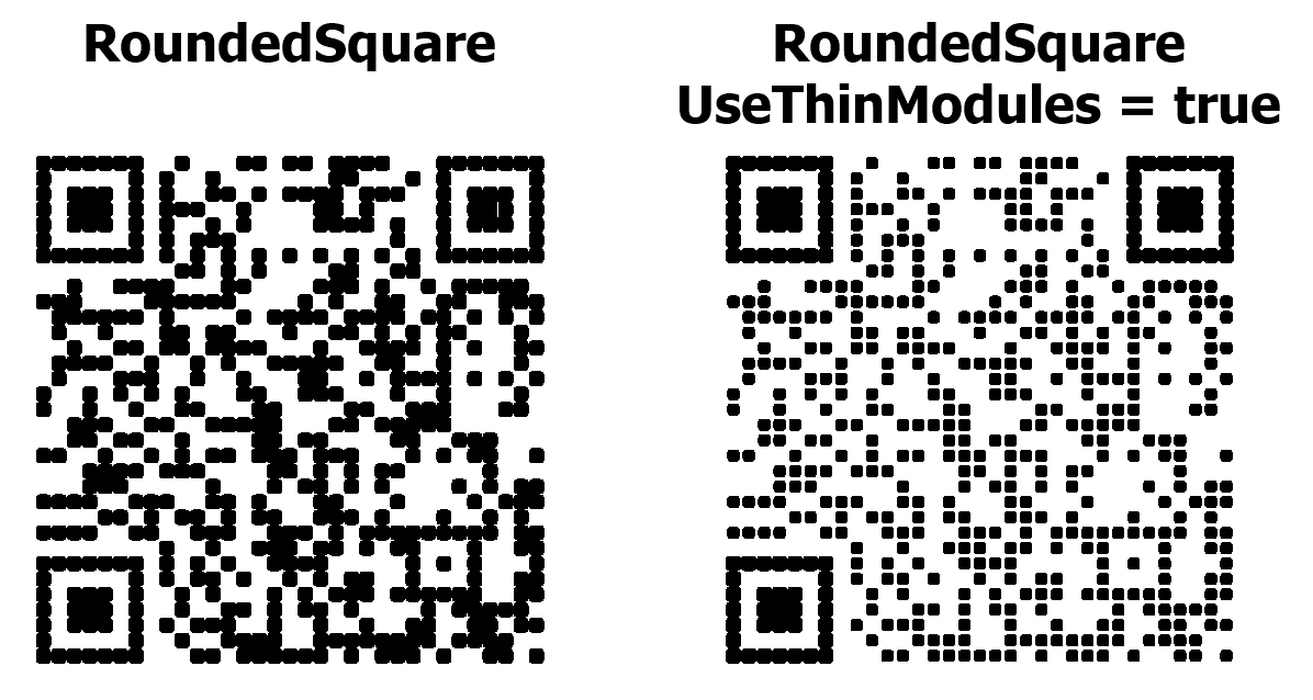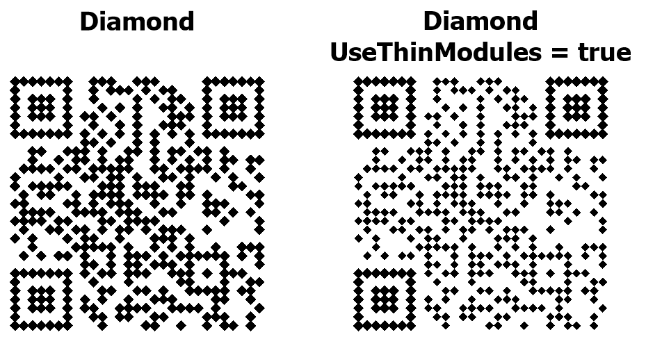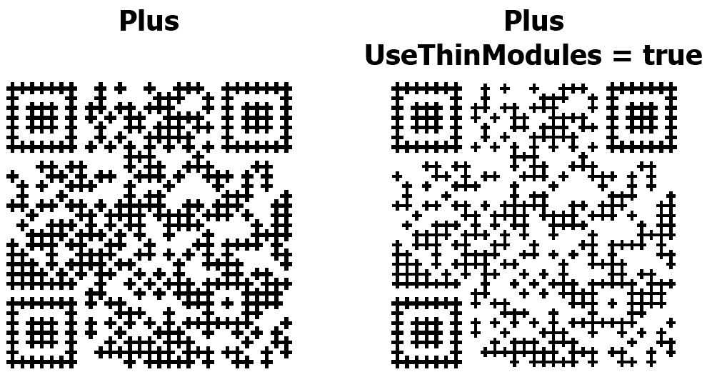 Свойство UseThinModules управляет визуальной плотностью модулей (точек) в QR-коде. При UseThinModules = false (по умолчанию) модули занимают всё доступное пространство в своей ячейке, точки соприкасаются друг с другом без промежутков – QR-код выглядит сплошным и плотным. При UseThinModules = true размер модулей уменьшается, между ними появляются видимые промежутки – QR-код выглядит более разреженным, создаётся эффект «сетки» или «точечного узора».
