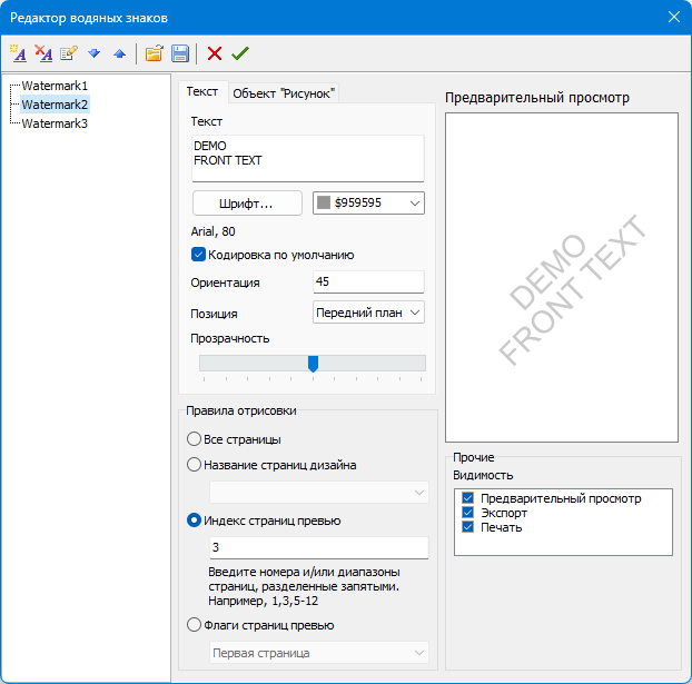 Справа вверху располагается предпросмотр водяного знака, а под ним набор флагов, которыми можно задавать видимость полученного водяного знака при предварительном просмотре, при экспорте и при печати.