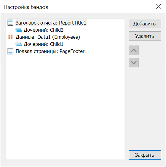 В наших отчетах может быть множество типов бэндов, у которых разное назначение. Например, заголовок отчет всегда находится в начале отчета. Другой пример, подвал страницы находится внизу каждой страницы. Положение таких бэндов относительно друг друга, изменять нельзя.