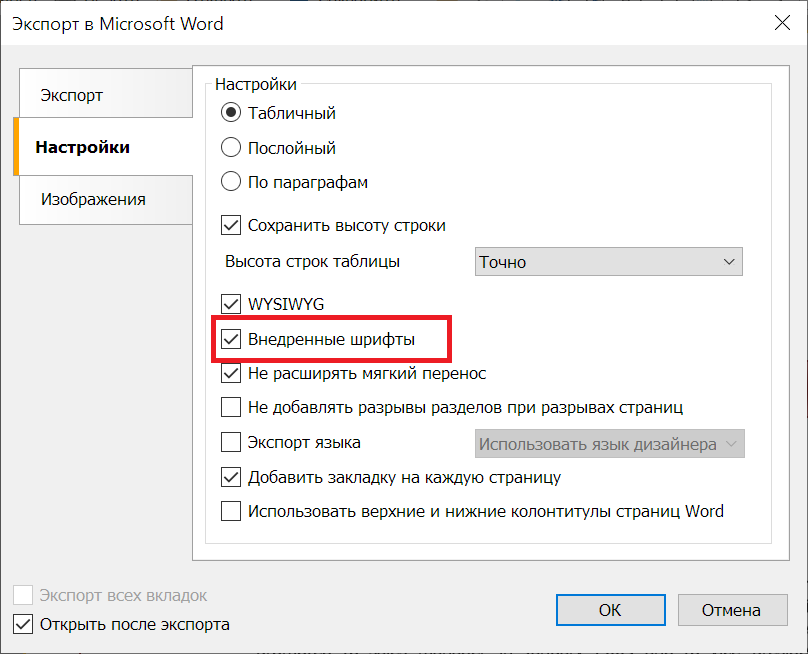 В нашем экспорте отчетов в документы Microsoft Word, появилась новая опция «Внедренные шрифты»: