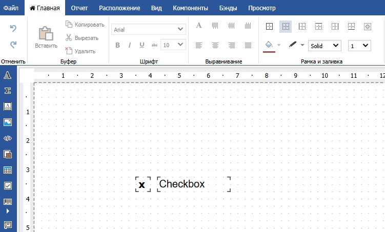 В версии 2026.1 добавлен компонент Checkbox для отчетов в формате .fr3 (FastReport VCL). Компонент представляет собой булево поле, которое позволяет отображать состояние "включено/выключено" в отчетах. Checkbox может использоваться на страницах отчета для визуализации булевых значений из источников данных или для интерактивного взаимодействия с пользователем.