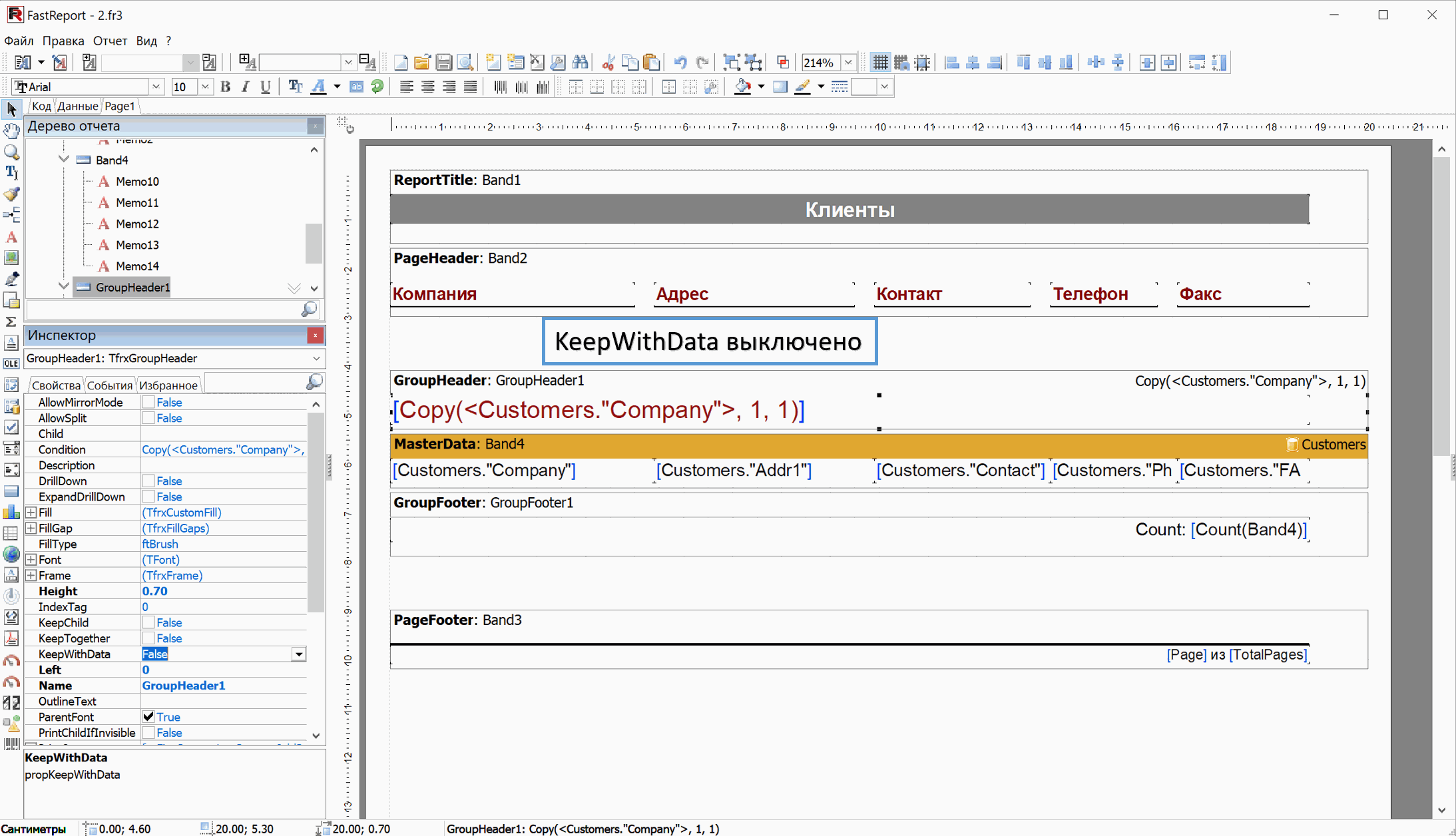 Теперь управлять бэндами отчета стало проще. У заголовков и подвалов групп появилось новое свойство KeepWithData. Оно указывает, что заголовок или подвал группы должны оставаться вместе с записью данных при переносе на новую страницу. Это свойство аналогично KeepHeader и KeepFooter, но работает с бэндами группы.