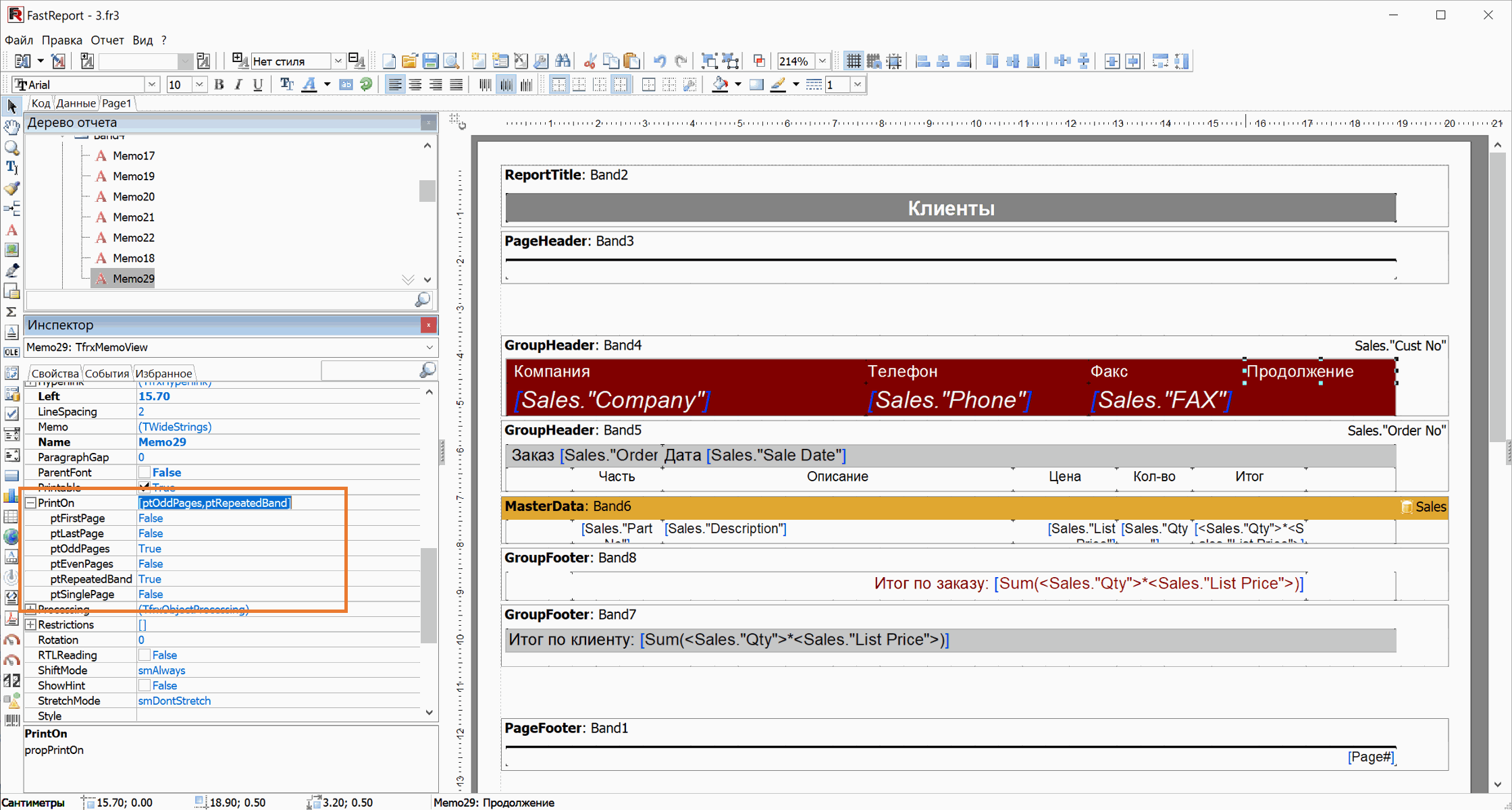 Также расширились возможности управления выводом объектов отчета. Новое свойство PrintOn предлагает набор флагов для точной настройки. Например, можно выводить объект только на заголовках, которые повторяются на новой странице (флаг ptRepeatedBand), или только на первой странице отчета (флаг ptFirstPage).