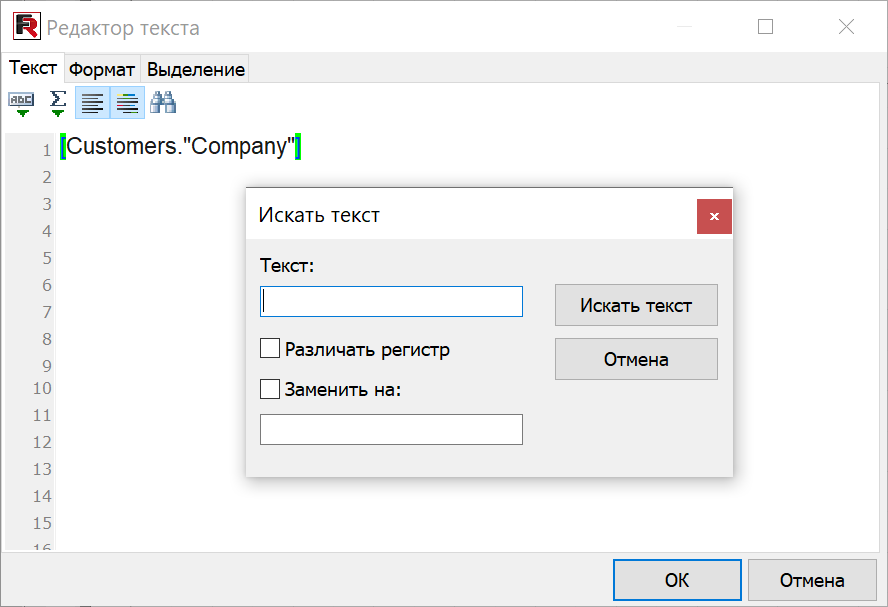 Теперь в FastQueryBuilder, как и в дизайнере отчетов, есть функции поиска и замены в редакторах.