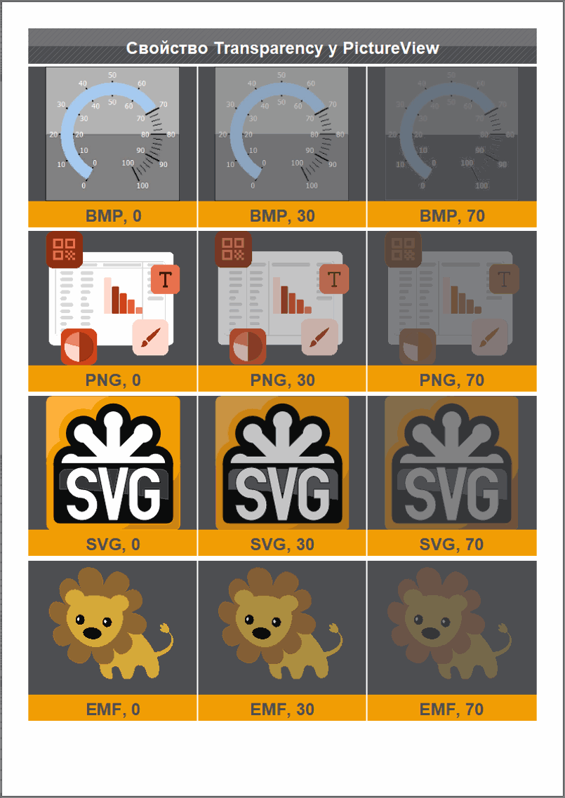 Переработанный вывод изображений получил конвейер постобработки. Это позволило добавить новые свойства для постобработки объекта TfrxPictureView: Transparency для установки маски полупрозрачности; поворот изображения и зеркалирование.