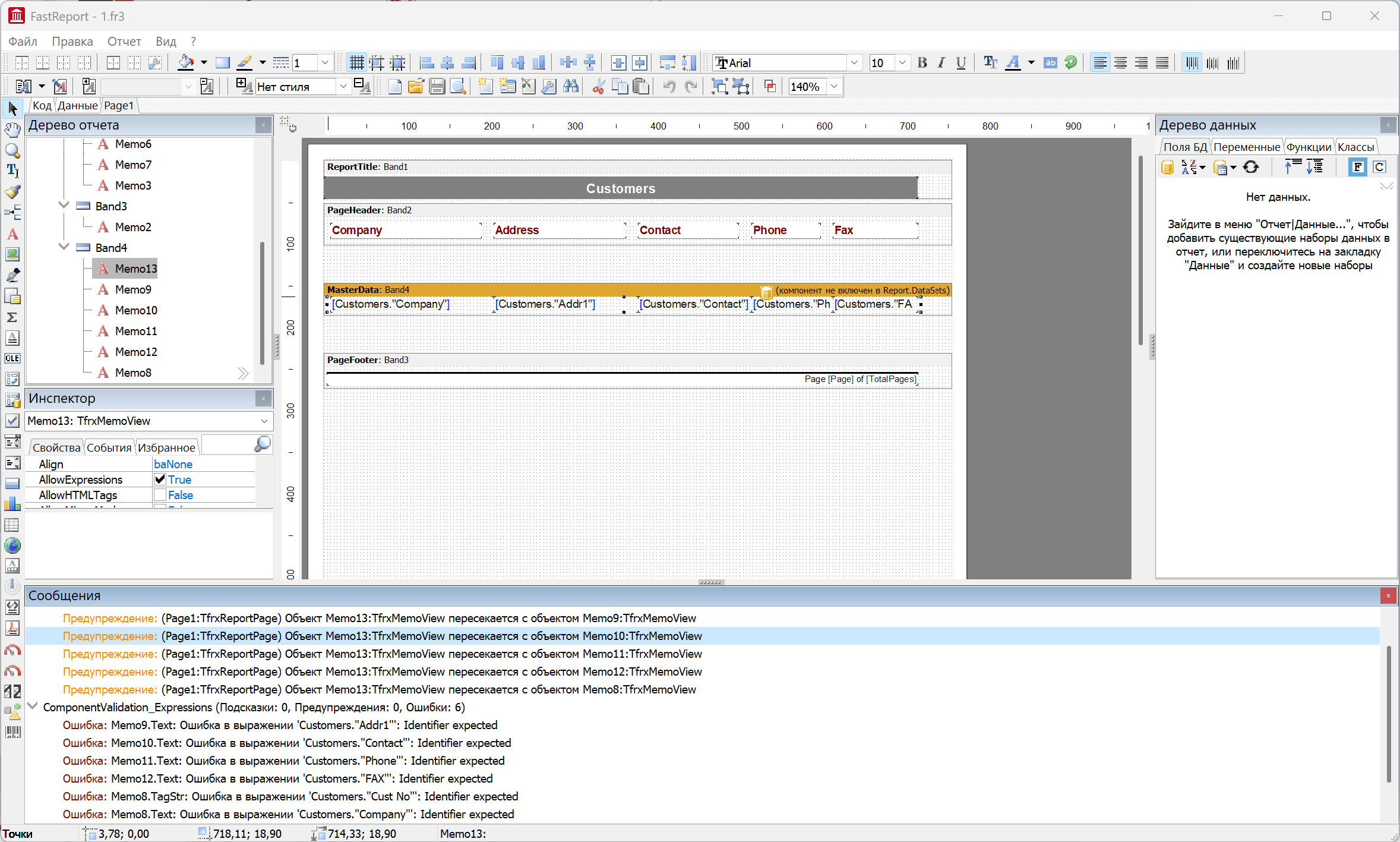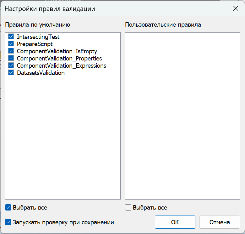 Система валидации содержит набор правил для валидации: пересечения объектов, конфликтующих свойств, наборов данных, выражений, пустых объектов и скрипта отчета. Вы можете запретить сохранение отчетов, не проходящих валидацию для пользователей.