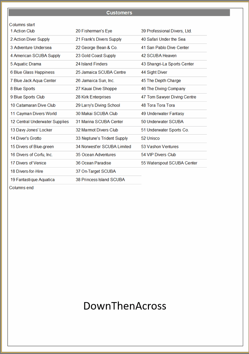 В движок отчета добавлена функция управления расположением колонок бэндов с помощью свойства TfrxDataBand.BandColumns.Layout. Это свойство позволяет выбирать порядок вывода колонок: сначала вправо, затем вниз (AcrossThenDown) или сначала вниз, затем вправо (DownThenAcross). В режиме DownThenAcross можно задать максимальное количество строк в колонке через свойство MaxRows. По умолчанию используется среднее значение от общего числа записей.