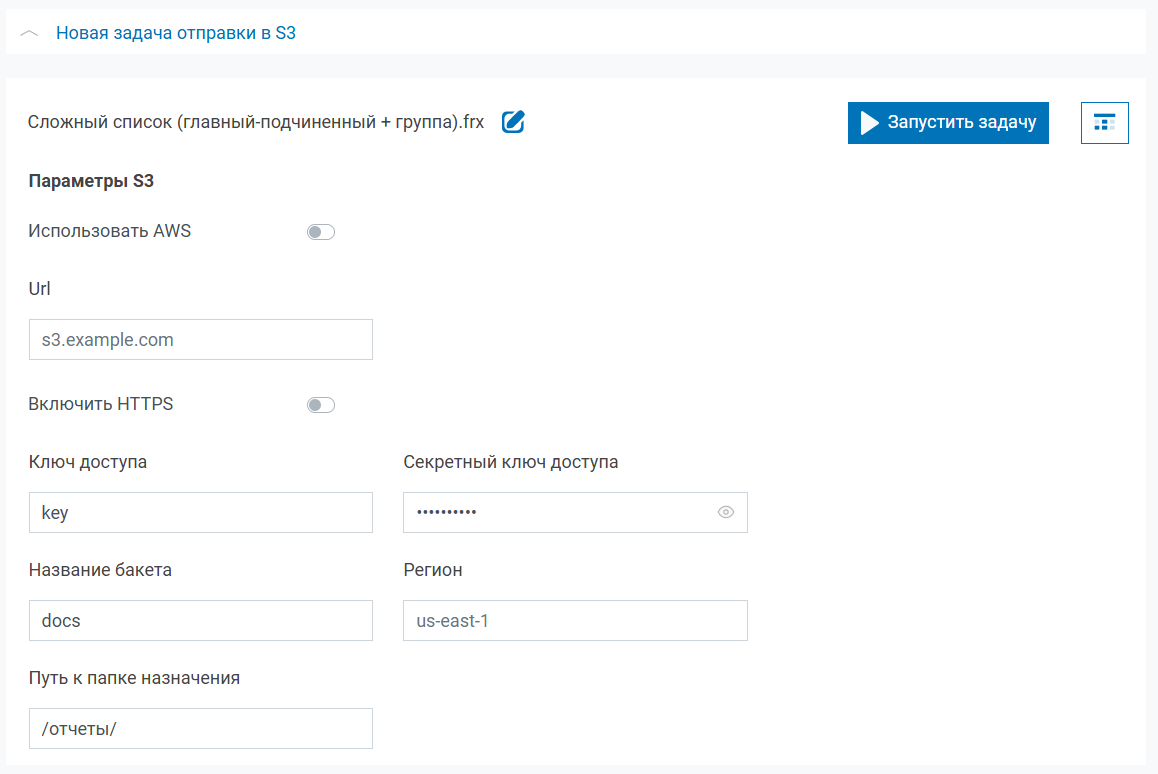 Добавлен компонент для работы с Amazon S3-совместимыми хранилищами. Это позволяет сохранять в S3 как шаблоны, отчёты, так и готовые документы в различных форматах (pdf, docx, xlsx и др.). Один из сценариев использования – создание годового отчёта (с передачей даты начала и конца в параметры отчёта), экспорт в PDF и сохранение в S3-совместимое хранилище, в котором оно будет доступно для просмотра и скачивания. Подробнее про задачу сохранения в S3 и её использование из кода смотрите в документации.