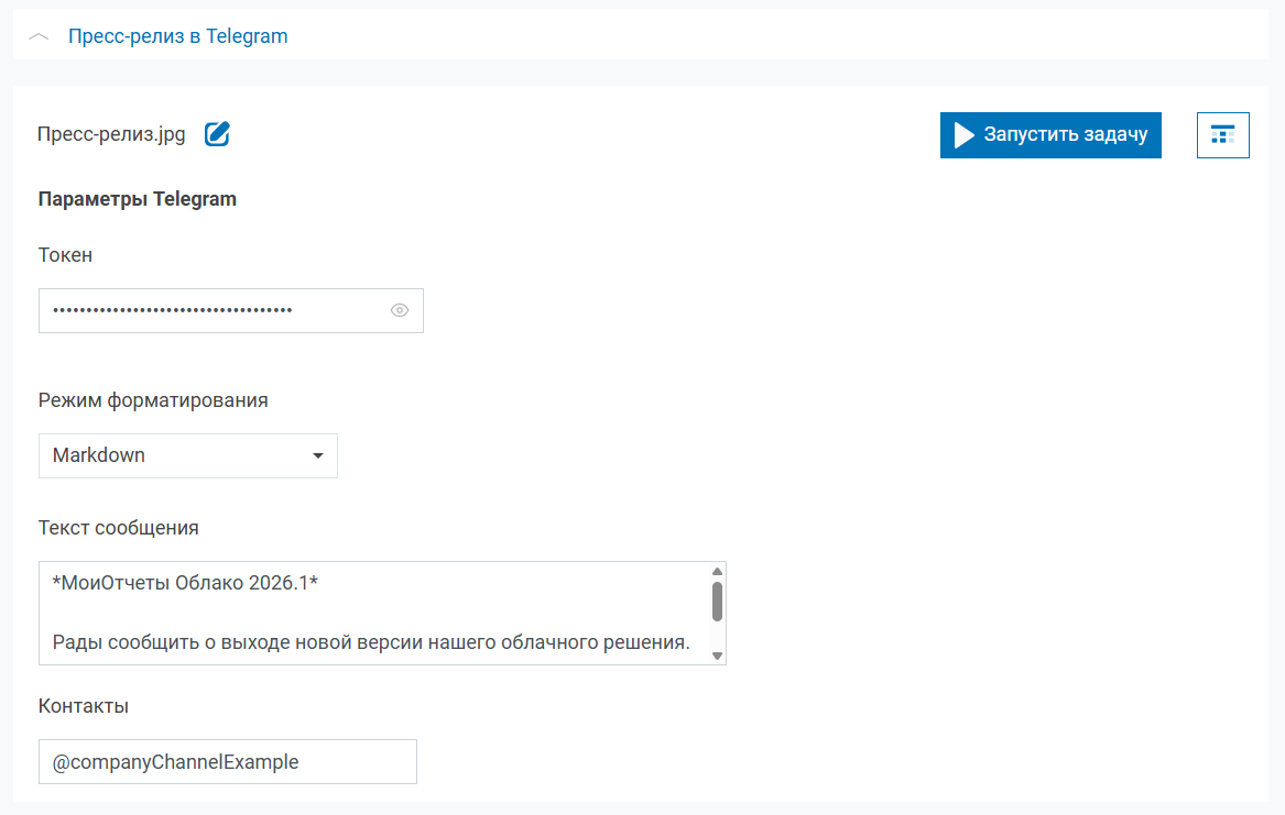 Добавлена поддержка Telegram Bot API. Как и в задаче сохранения в S3, в Telegram можно отправлять документы и шаблоны отчёта. Поддерживается отправка в каналы, личные сообщения с чат-ботом и групповые чаты. Для отправки следует использовать уникальный идентификатор или имя публичного канала или группы, в которую добавлен бот. Подробнее про Telegram-ботов и их создание можно узнать на официальном сайте Telegram.