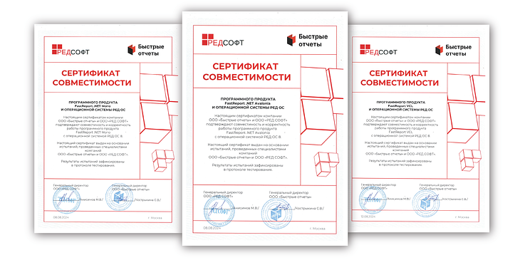На основании проведённых испытаний компании ООО «Быстрые отчеты» и ООО «РЕД СОФТ» получили сертификаты о совместимости программных продуктов FastReport .NET Mono, FastReport .NET Avalonia и FastReport VCL с операционной системой РЕД ОС 8. По итогам тестирования была подтверждена совместимость и корректность работы продуктов компаний.
