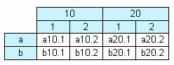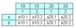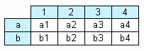 На рисунке мы видим таблицу с двумя строками и четырьмя столбцами. Здесь a, b – заголовки строк, 1, 2, 3, 4 – заголовки столбцов, a1..a4, b1..b4 – ячейки. Чтобы построить такой отчет, нам понадобится всего один набор данных (запрос или таблица), который имеет три поля и содержит следующие данные: