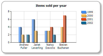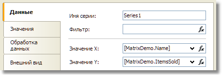 Продемонстрируем создание авто-серий на примере. Используем таблицу MatrixDemo, чтобы получить график продаж сотрудников с разбивкой по годам. Одна серия будет представлять один год. Для этого проделайте следующие шаги: