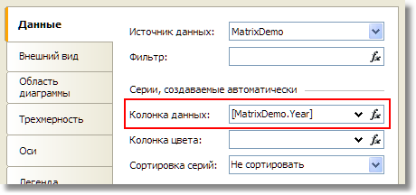 - у объекта "Диаграмма" указать колонку данных для авто-серии. Значение этой колонки будет являться именем серии. Если серии с таким значением еще не существует, будет автоматически создана новая серия.
