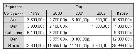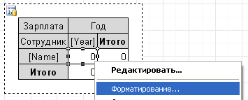 Осталось задать формат, в котором выводятся денежные значения. Для этого щелкните на первом объекте, представляющем ячейку (он находится на пересечении [Year] и [Name]), вызовите его контекстное меню правой кнопкой мыши и выберите пункт "Форматирование...".