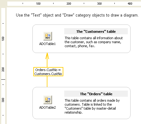 Другие полезные возможности На закладке "Данные" можно размещать не только компоненты доступа к данным. С помощью объектов "Текст" и "Рисование" здесь можно размещать поясняющие надписи и рисовать простые диаграммы, как показано на рисунке: