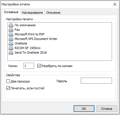 Вы также можете указать, сколько копий отчета печатать и надо ли делать разбор по копиям. Заданные в этом диалоге значения будут показаны в окне "Печать".