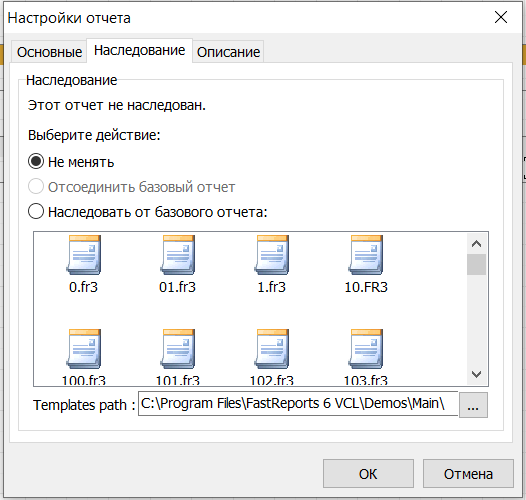 Подробнее о наследовании см. в главе "Наследование отчетов". Здесь можно посмотреть, от какого отчета наследован текущий отчет, отсоединить базовый отчет (при этом отчет перестает быть наследованным и становится самостоятельным), а также наследовать отчет от одного из выбранных.
