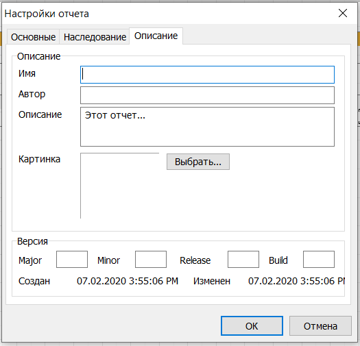 Вы можете задать такие параметры отчета, как имя (оно отображается в окне предварительного просмотра и присваивается заданию печати), автор, описание, картинка, версия. Все эти параметры являются необязательными и служат для информационных целей.