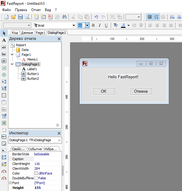 на панели инструментов дизайнера - она добавляет в отчет новую страницу. При переключении на страницу с формой диалога рабочее поле дизайнера изменяется - теперь это форма, на которой можно размещать объекты - элементы управления: