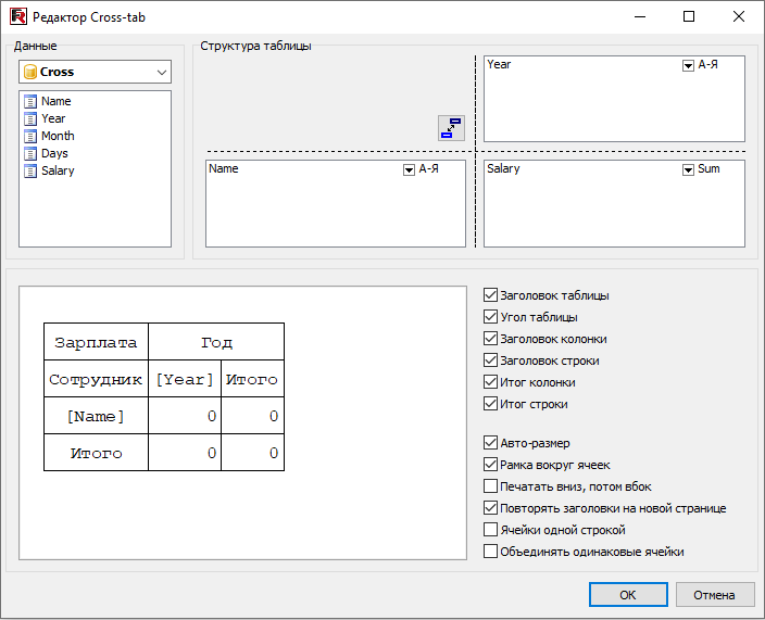 Количество объектов для матричного отчета ограничено только теми, что могут быть отображены в текстовом виде. Среди них – объект «Кросс-таб». Рассмотрим создание простого кросс-отчета, аналогичного ранее построенному в главе Таблица с составными заголовками.