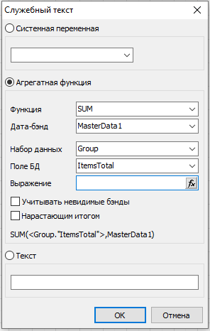 Во-первых, мы можем использовать для вывода значения агрегатной функции объект "Системный текст". По сути, это тот же самый объект "Текст", но имеющий специальный редактор для более удобной вставки системных переменных или агрегатных функций.