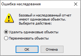 Это произойдет в случае, если в двух отчетах имеются объекты с одинаковыми именами. Вы можете либо удалить такие объекты из наследованного отчета, либо переименовать их.