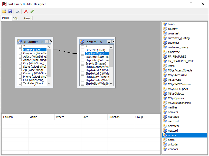 Перетаскиваем на рабочее поле две таблицы – Customers и Orders. Обе таблицы имеют поле CustNo, по которому мы должны их связать. Путем перетаскивания поля CustNo из одной таблицы в другую мы создаем связь между таблицами: