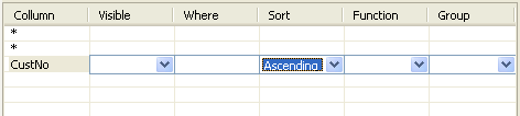 Теперь необходимо отметить поля, которые должен включать в себя запрос, и сгруппировать его по полю CustNo. Для этого отметьте галочками поля "*" в обеих таблицах, а также поле CustNo в таблице Customer. В нижней части окна появятся выбранные нами поля, после чего надо выбрать сортировку для поля CustNo: