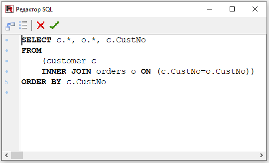 Ранее мы рассматривали работу отчета с группами (глава "Отчет с группами"). Построим запрос для этого отчета с помощью конструктора запросов. Нам необходимо составить запрос на языке SQL, который вернет данные из обеих таблиц, сгруппированные по определенному условию. В нашем случае условие – соответствие полей CustNo в обеих таблицах.
