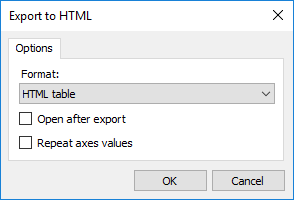 | HTML Format | Possible values: HTML table - export to HTML table (table tag); Excel Worksheet HTML - export to HTML format with Excel extensions |